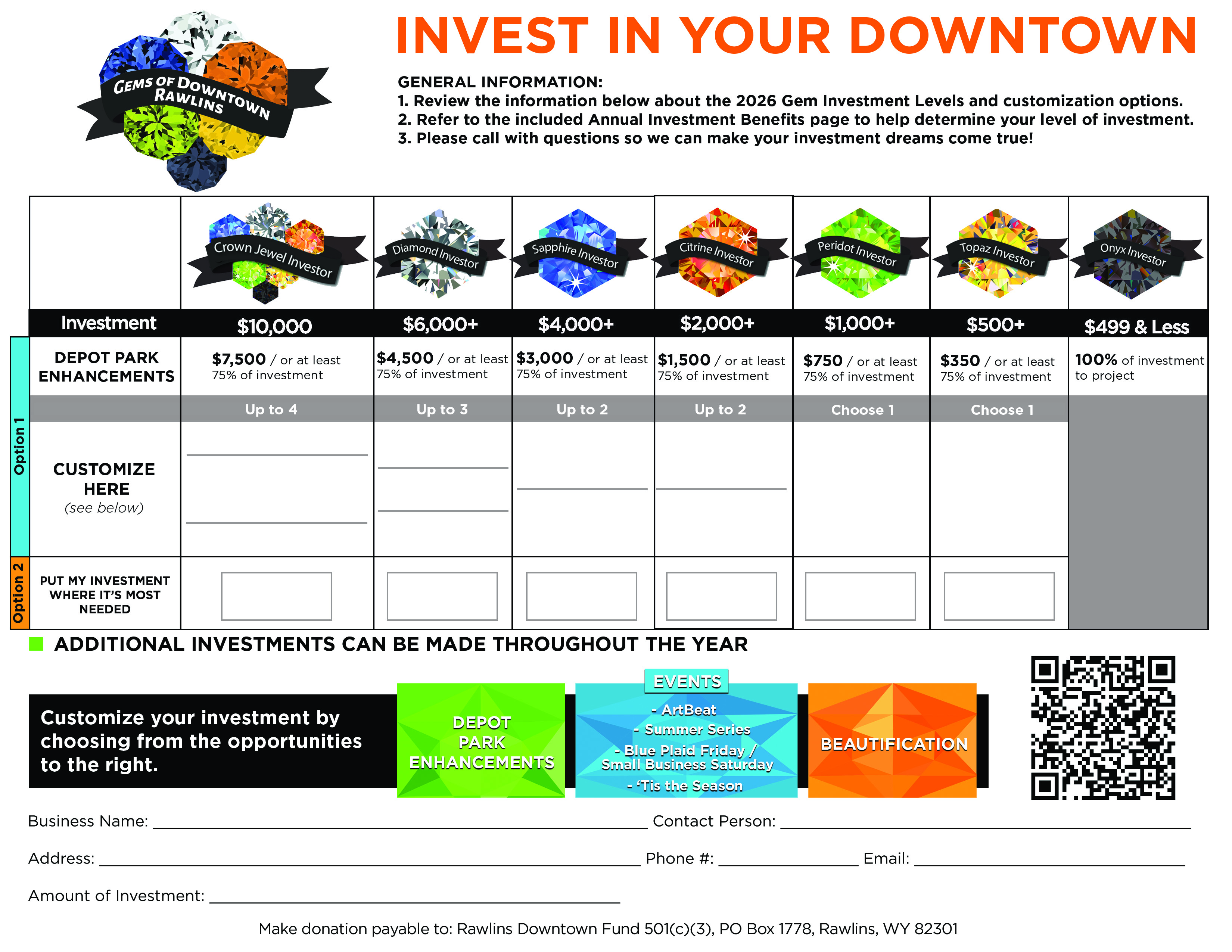 Your investment helps create real, visible improvements for families, businesses, and visitors in Rawlins. We’d love to have you as a Gem of Downtown.